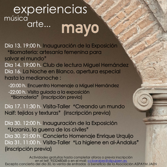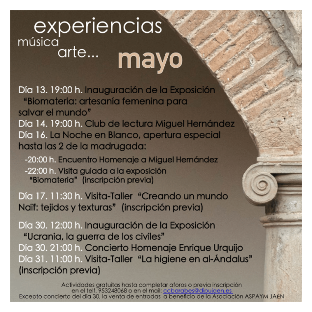 Sala de Exposiciones Temporales I; Centro Cultural Baños Árabes- Palacio de Villardompardo. Actividad gratuita previa inscripción en el telf. 953248068 o en el email: ccbarabes@dipujaen.es