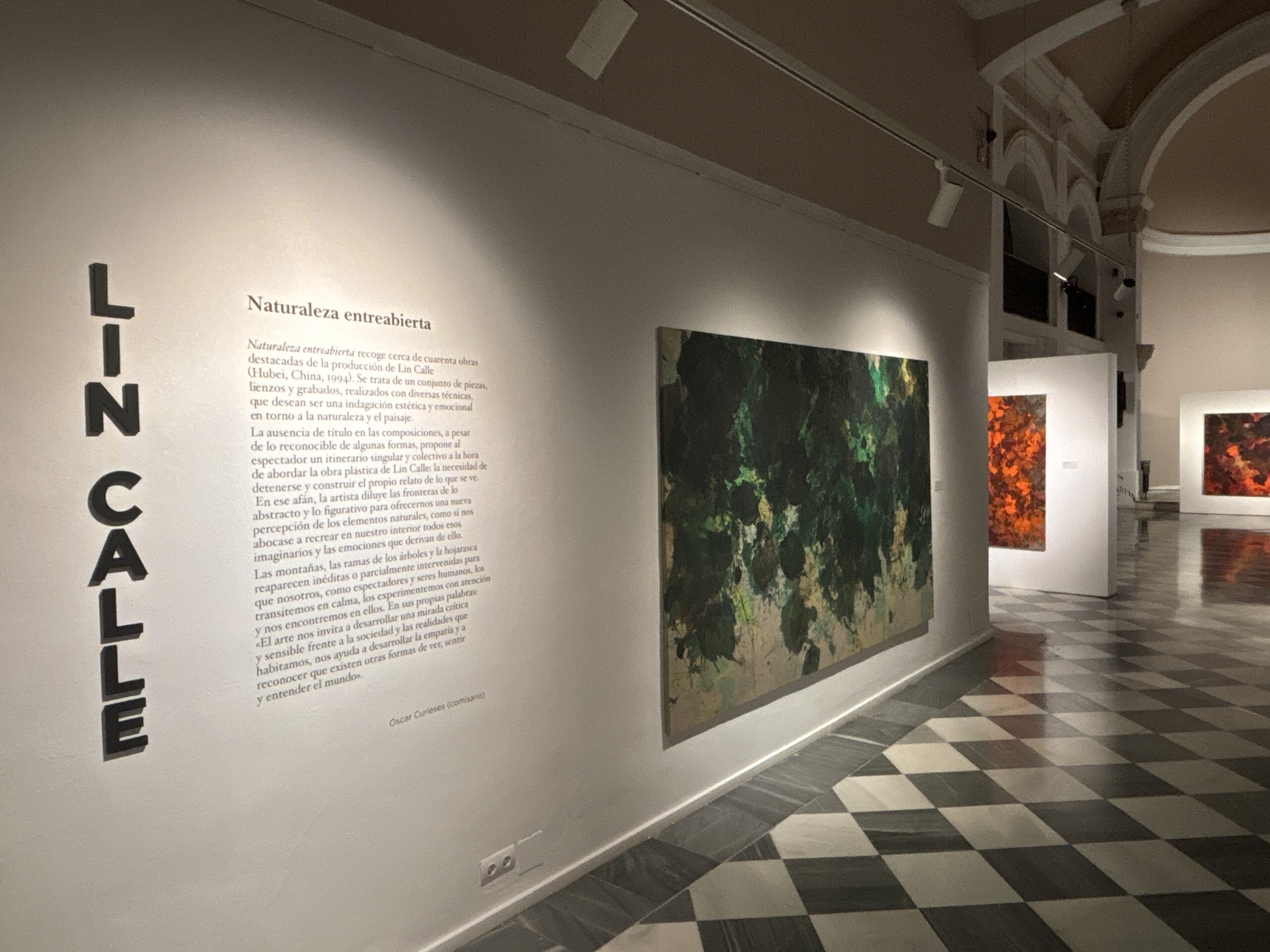 Naturaleza entreabierta es una exposición de la artista de Lin Calle, comisariada por el escritor Óscar Curieses. La muestra explora la visión del paisaje natural a través de los vasos comunicantes entre lo figurativo y la abstracción. Esta joven artista de origen chino, radicada en Madrid, ha expresado desde los inicios de su trayectoria un notable y constante interés por lo matérico de ciertos elementos presentes en la naturaleza tales como la vegetación y sus espesuras, los senderos entreabiertos en el bosque, las texturas de los suelos recubiertos de hojarasca o las montañas revestidas de ramajes y arboledas. Esa inclinación de la artista hacia la materialidad de naturaleza tiene que ver con la singularidad de los colores y las formas, pero también con la invocación de una belleza extrañada que cuestiona nuestra percepción habitual. Ese mirar, tan lúcido y particular de Lin Calle, une y diluye la subjetividad con la objetividad, y nos ofrece una percepción renovada de los elementos naturales que no excluye la sombra, lo caótico y el misterio presente en todo paisaje. La mancha y el color en expansión son quizá los elementos primordiales de su trabajo. Como si se tratase de un embrión, todo parte de ahí y posibilita el resto de la imagen, que se concreta a través de capas y formas hasta cierto punto reconocibles.