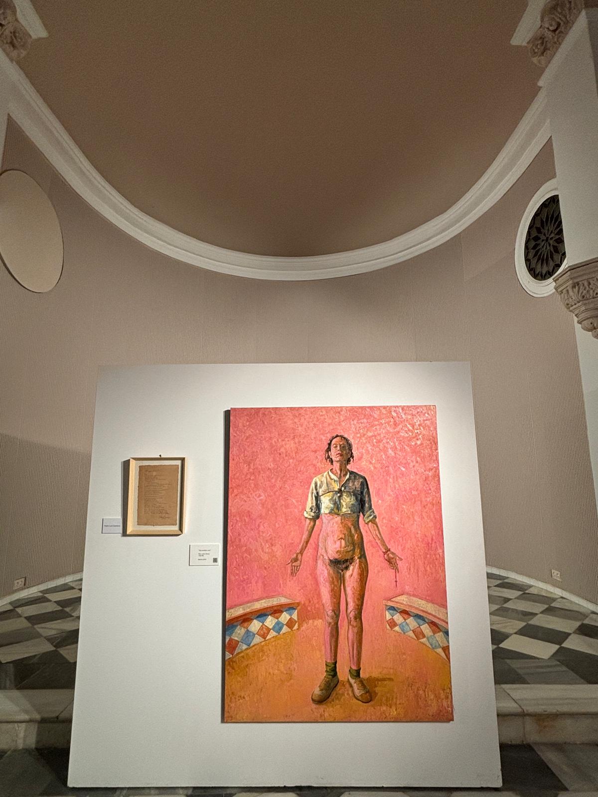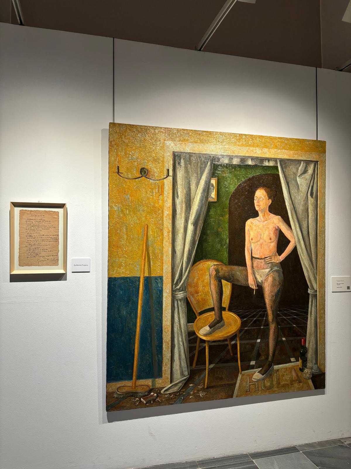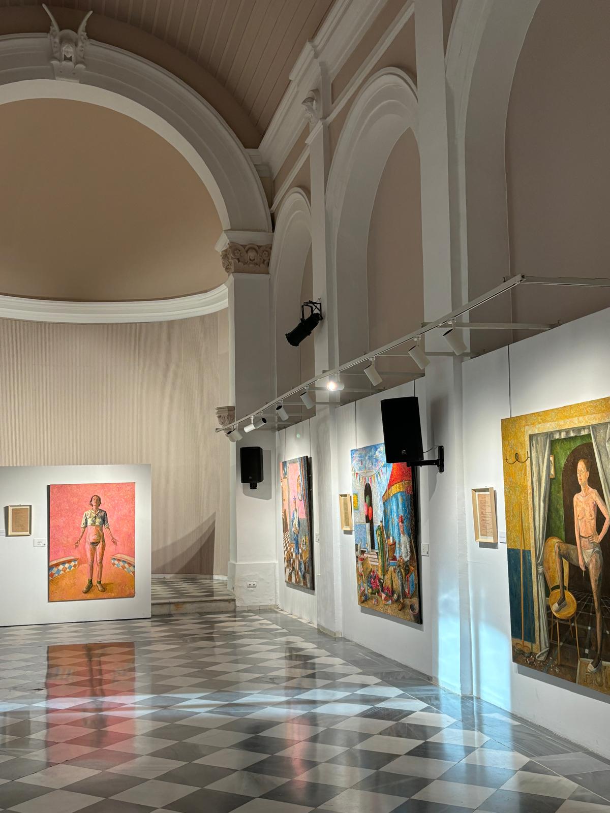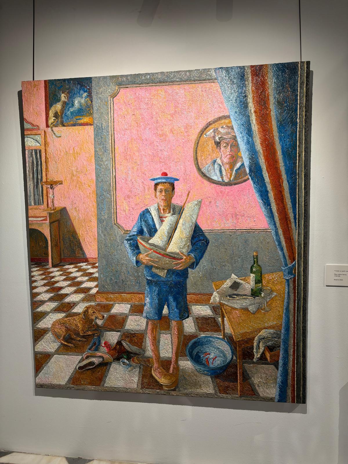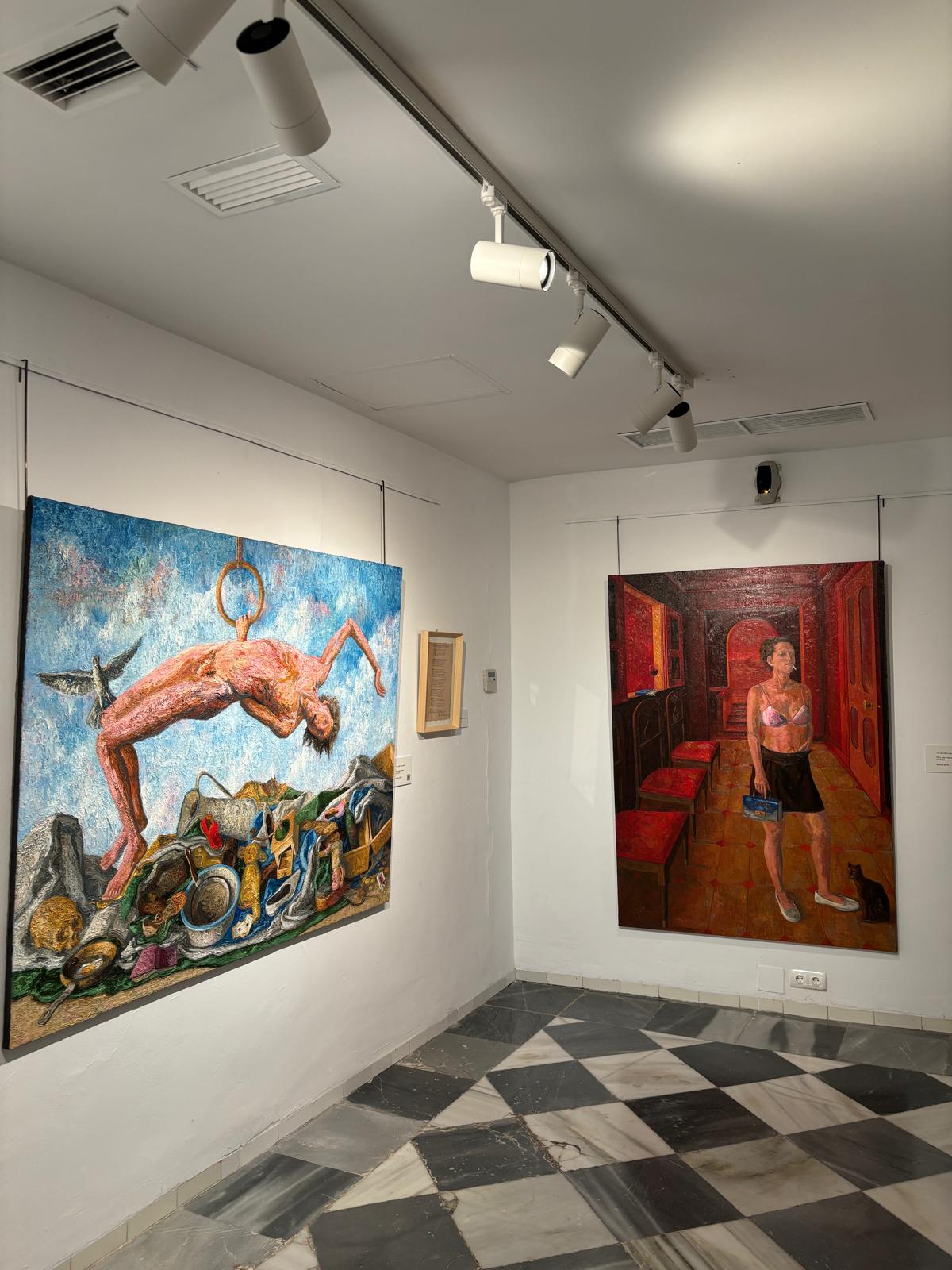 El hilo conductor de estas pinturas es una mirada íntima hacia la figura humana, hacia el sentido grotesco y absurdo de la existencia. Son personajes solitarios y marginales, que posan estáticos, mirando al espectador, recluidos en una habitación, con el punto de fuga de las baldosas ajedrezadas, la puerta al fondo, la ventana o la cortina. Cada una de estas figuras sugiere una experiencia, un extrañamiento y un misterio que nos interroga: ¿Quiénes son? ¿Qué hacen? ¿Qué quieren? ¿Qué representan? Son seres con alma: son «el otro», pero también son parte de nosotros mismos. A ello contribuyen los objetos que rodean a cada personaje, pequeños bodegones, muestra de un humor que cuestiona los límites de nuestra existencia cotidiana, y donde su autor establece guiños autobiográficos y hacia la historia del arte.